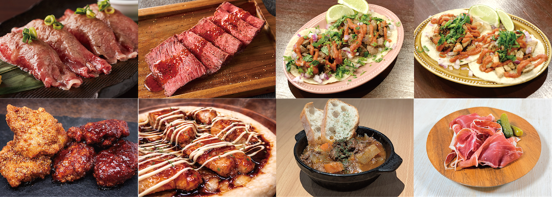お肉を分かち合うことで会話が生まれ、人がつながる。そんな“シェアして楽しむシーンにもぴったりな肉料理をご紹介。【WORLD DINER】からは、醤油・わさび・岩塩で味の変化を楽しめる、「黒毛和牛炙り肉寿司」と、特製トリュフソースで味わう「北海道産牛のローストビーフ」が登場。メキシコ大使館でタコスを振る舞った実力派タコス店【CIELO’S MEXICAN】の「ビーフタコス」は、角切りの牛ハラミを使った本場スタイル。「チキンタコス」は、レモン&にんにくの特製だれで仕上げたやみつき必至の味わい。